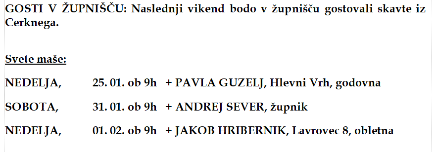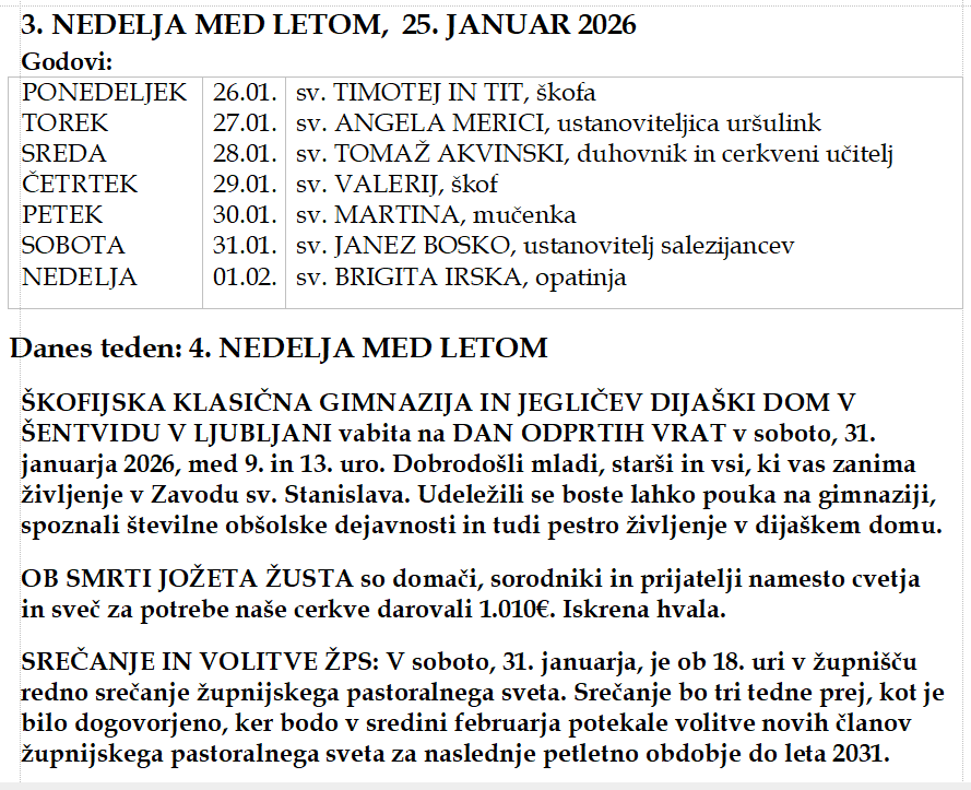 Zadnja oznanila Oznanila 25. januar 2026 25. januar, 2026 Oznanila Oznanila-Vrh-25.01.2026_3.NEDELJA_MED_LETOM Stara oznanila Zahvala ob smrti Jožeta Žusta 25. januar, 2026 Oznanila Oznanila 18. januar 2026 Oznanila-Vrh-18.01.2026_3.NEDELJA_MED_LETOM 17. januar, 2026 Oznanila Oznanila 11. januar 2026 Oznanila-Vrh-11.01.2026_JEZUSOV KRST 11. januar, 2026 Oznanila Oznanila 4. januar 2026 Oznanila-Vrh-04.01.2026_2_PO_BOŽIČU 3. januar, 2026 Oznanila Verska statistika župnije 2025 02. Verska statistika župnije Vrh_matrica (1) 2. januar, 2026 Oznanila Starejša oznanila