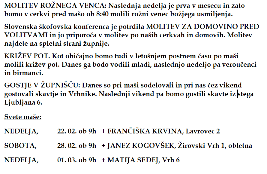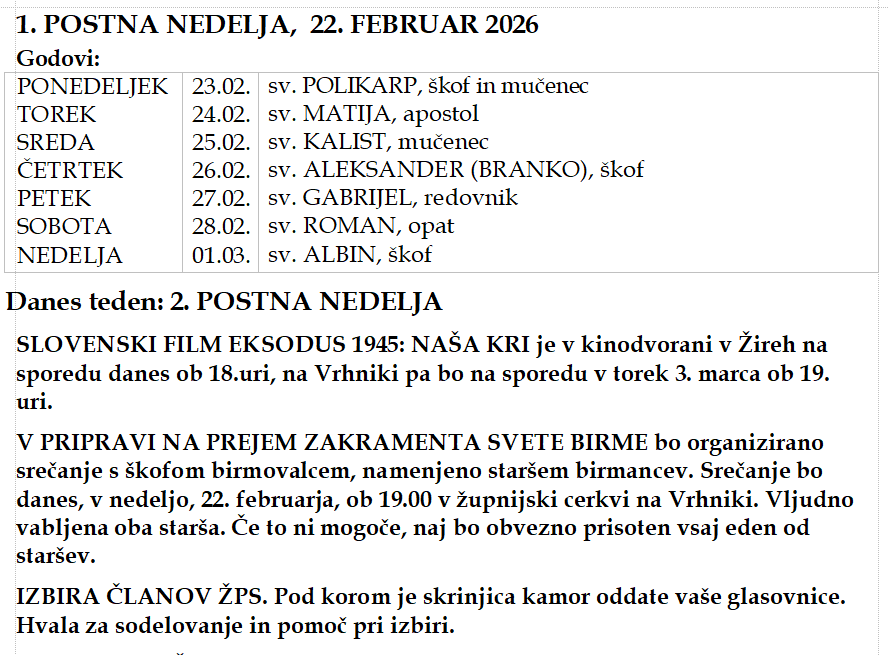 Zadnja oznanila Oznanila 22. februar 2026 21. februar, 2026 Oznanila Oznanila-Vrh-22.02.2026_1.POSTNA V2 Stara oznanila Oznanila 15. februar 2026 Oznanila-Vrh-15.02.2026_6.NEDELJA_MED_LETOM 14. februar, 2026 Oznanila Oznanila 8. februar 2026 Oznanila-Vrh-08.02.2026_5.NEDELJA_MED_LETOM 8. februar, 2026 Oznanila Zapisnik 17. srečanja ŽPS, 31. januar 2026 ZPS-zapisnik-21_26-17 8. februar, 2026 Oznanila Oznanila 1. februar 2026 Oznanila-Vrh-01.02.2026_4.NEDELJA_MED_LETOM 1. februar, 2026 Oznanila Oznanila 25. januar 2026 Oznanila-Vrh-25.01.2026_3.NEDELJA_MED_LETOM 25. januar, 2026 Oznanila Starejša oznanila