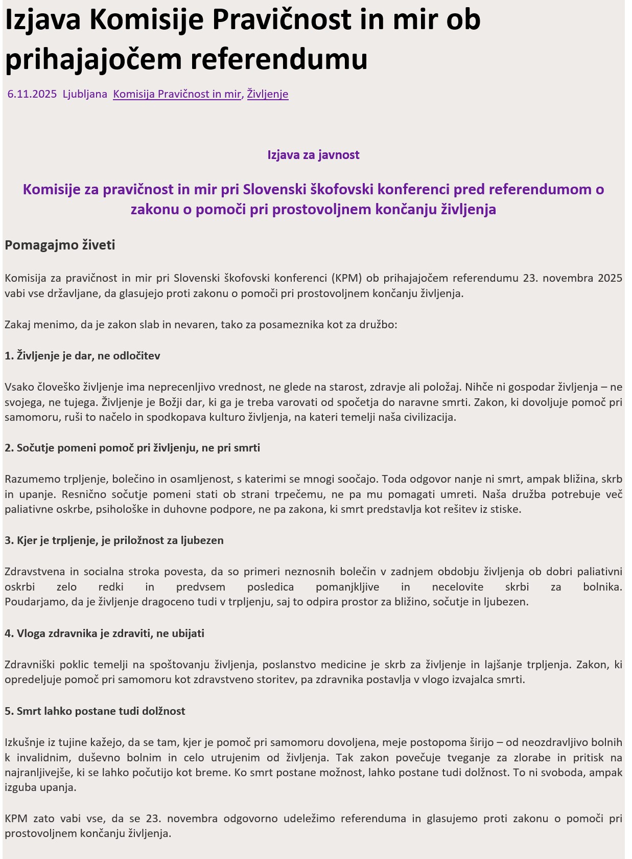 Izjava komisije Pravičnost in mir ob prihajajočem referendumu